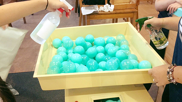 在進入遊戲區時,雙手也需噴灑消毒噴霧,